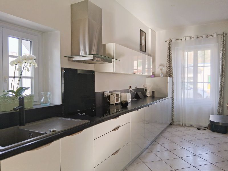 - En rez-de-chaussée : cuisine aménagée/équipée récente, salle à manger avec baie vitrée, séjour/salon avec poêle à bois, chambre avec dressing et baie vitrée, salle d'eau/WC,